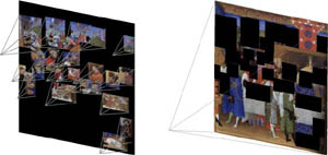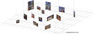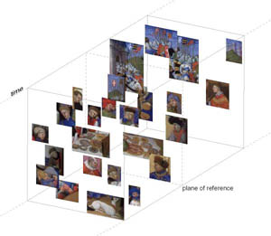The piece uses the painting “Les tres heures ”in demonstrating the similarity of distortion viewing principles with the medieval image space with its fluid transition between the scales of objects and people in the composition and therefore also in the representation of space.The image reveals additional text based information upon certain expansion of a subarea.