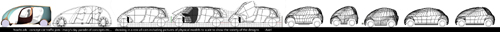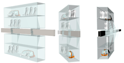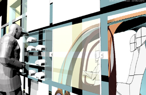 First exhibition proposal - laying out the idea of a facetted secondary wall in front of the windows to the libraries. The facetts were to present 1-1 views of the cars in different models - wireframe, rendered etc switching within the same model to break up their big size and reflect the multi facetted nature of the exhibition - Axel Kilian May 2004